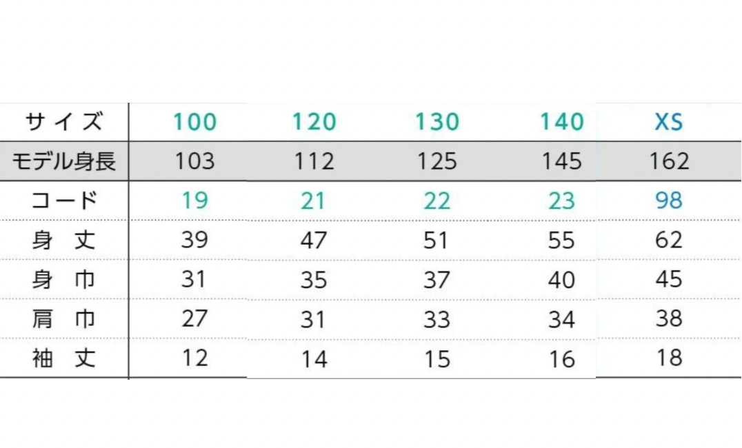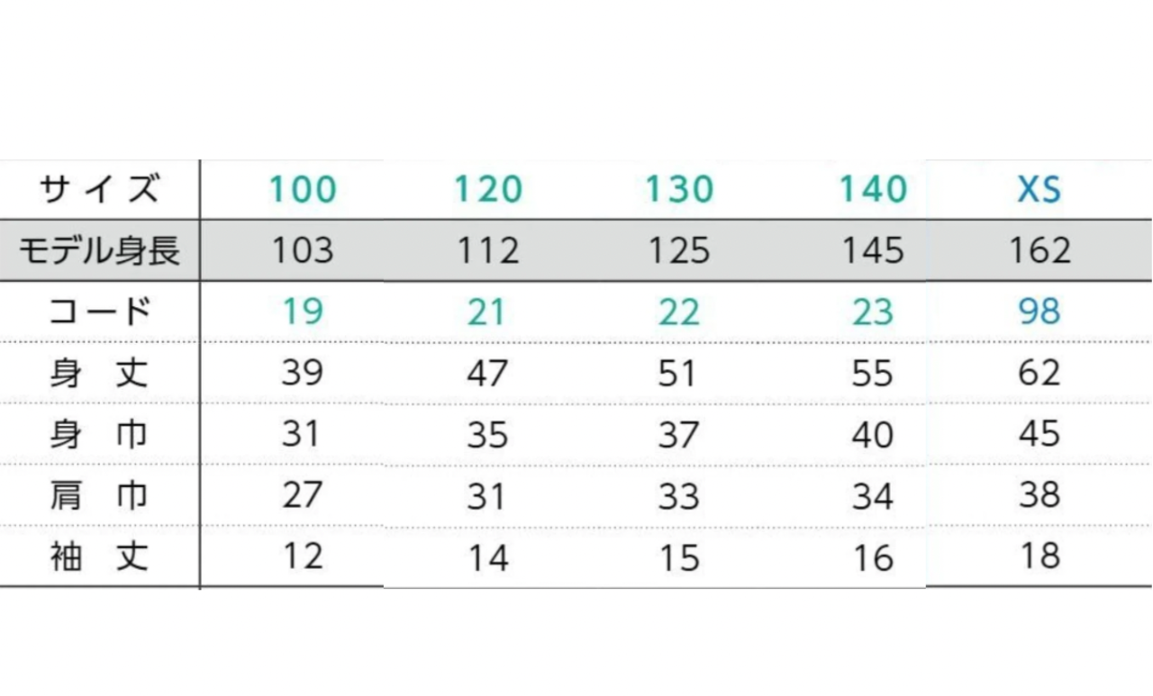 キッズサイズ 120 140 160(XS)のサイズ展開。