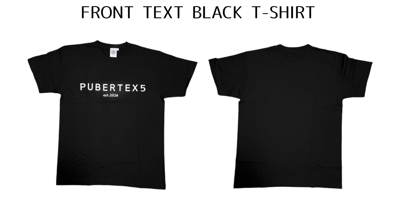A black T-shirt with the design of PUBERTEX5 on the front.