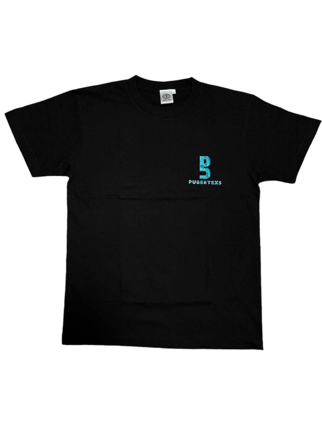 ブラックベースにマキシマムブルーグリーンのカラーが印象的なTシャツ。